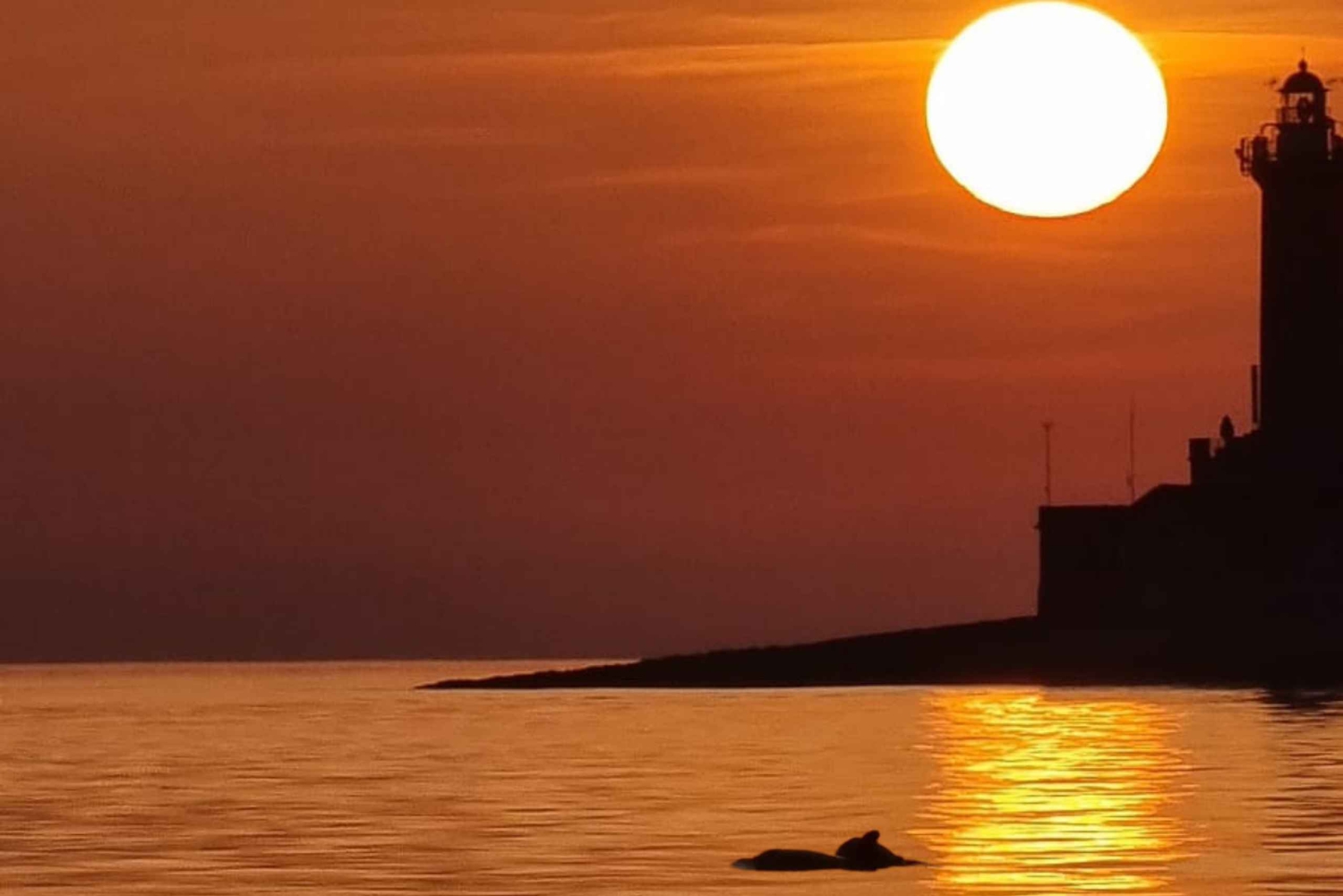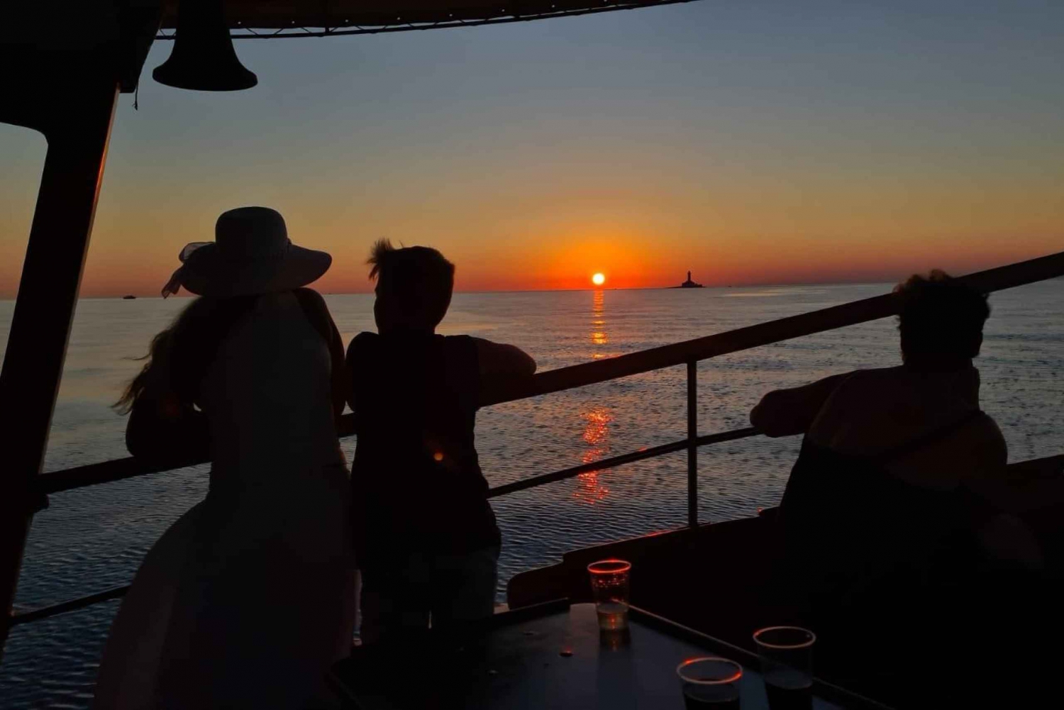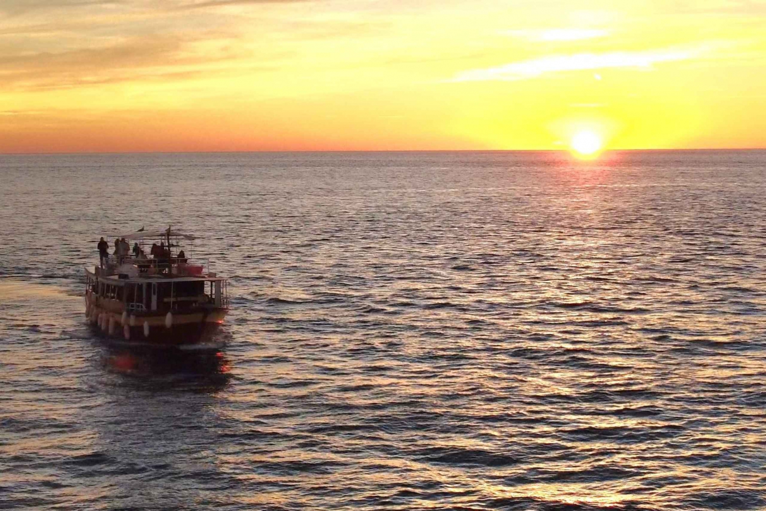 Din aftenudflugt starter i Medulin havn. Efter ombordstigning får du en velkomstdrink, og turen begynder med en panoramaudsigt over Medulins øhav. Mens du sejler langs Adriaterhavet, skal du holde øje med delfiner. Der er 85 % chance for, at du ser dem, men hvis ikke, kan du stadig nyde den fantastiske natur. Nyd den smukke udsigt til den østrig-ungarske fyrtårn 'Porer' undervejs, og senere får du mulighed for at beundre en fantastisk solnedgang. Hver solnedgang er forskellig, hvilket giver dig mulighed for at opleve en varieret palet af røde, orange og lilla solnedgange. Prøv lykken. Under hele bådturen er der musik om bord, hvilket skaber en afslappet atmosfære. Dans er også velkomment. Middagen serveres på båden: fisk, tunsteak, kød og vegetariske retter er tilgængelige med kålsalat og ciabattabrød. Drikkevarer under hele udflugten (øl, vin, sodavand og vand) er inkluderet i prisen som en velkomstschnappe. Bådturen slutter med en langsom tilbagevenden til Medulin. Hver tur er unik og skaber en uforglemmelig oplevelse. Book din tur med Sandra-båden nu.