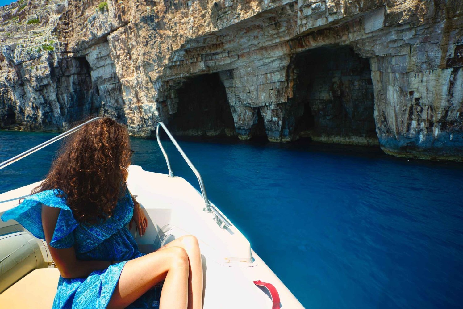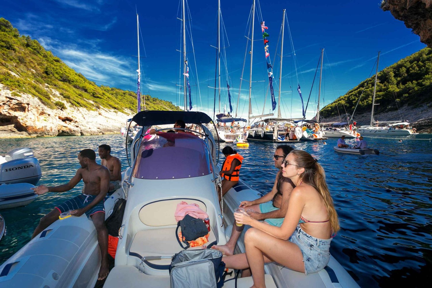 Begiv dig ud på en fascinerende rejse: Gruppeudflugt til den blå grotte og Pakleni-øerne Afgang fra Hvar Begynd dit eventyr fra den maleriske by Hvar. Når morgensolen står op, venter din komfortable speedbåd i havnen. Mød din venlige lokale skipper og dine medrejsende, og gør dig klar til en heldagsrejse over det glitrende Adriaterhav. Første stop: Den grønne grotte Efter en naturskøn 35-minutters sejltur ankommer du til Den Grønne Grotte, som ligger på en lille holm nær øen Vis. Grotten er opkaldt efter det magiske grønne lys, som skabes af sollyset, der reflekteres gennem vandet og algerne, og den er perfekt til svømning eller snorkling. Afhængigt af forholdene kan du enten svømme ind eller sejle ind med en lille officiel båd, der drives af havnemyndigheden. Glem ikke dit kamera - lysshowet derinde er virkelig enestående. Næste stop: Stiniva Bay Sejl til Stiniva Bay, en af Europas smukkeste strande, omgivet af tårnhøje klipper og kun tilgængelig ved at svømme eller med en lille båd. Nyd omkring en time her til at svømme, solbade eller tage en drink i den hyggelige strandbar. Den stenede kyst og det turkise vand gør dette til et virkelig uforglemmeligt stop. Højdepunktet: Den blå grotte En kort køretur senere ankommer du til turens højdepunkt - den blå grotte på øen Biševo. Din skipper hjælper dig med billetter og timing, mens du venter på din tur ved en nærliggende bar i skyggen. Du sejler ind i grotten i en lille motorbåd, der styres af de lokale myndigheder. Indenfor kan du beundre det livlige blå skær, som skabes af sollys, der passerer gennem en undervandsåbning. Dette naturlige lysshow giver en rolig, næsten overjordisk oplevelse. Personligt valgfrit stop Efter Blue Cave bliver rejseplanen fleksibel baseret på havforhold, gruppens præferencer og tid. Valgfrie stop kan omfatte: Budikovac Island (grøn lagune) til svømning Sælmunkens grotte Stončica-stranden Militær ubådstunnel fra anden verdenskrig Pakleni-øerne De charmerende byer Komiža eller Vis for en kulturel og lokal oplevelse Din skipper vil anbefale den bedste løsning på dagen for at sikre den mest behagelige rute. Sidste stop: Palmizana-bugten, Pakleni-øerne Slut dagen af ved Palmizana Bay, den mest berømte og eneste sandstrand på Pakleni-øerne. Slap af i en af de tre sandbugter, drik cocktails på Laganini Beach Bar, eller nyd en frokost på en af de tre populære restauranter ved havet. Du kan også gå en tur i den nærliggende botaniske have eller bare slappe af ved havet. Bemærk: Før juni og efter september kan turen være lidt kortere på grund af tidligere solnedgang, men med færre mennesker og mindre bådtrafik har du mere tid til at nyde hvert stop i fred og stadig besøge alle de planlagte steder i et afslappet tempo. Omkring kl. 18 sejler du tilbage til Hvar, mens solnedgangen maler himlen med nuancer af guld og rød.Includes