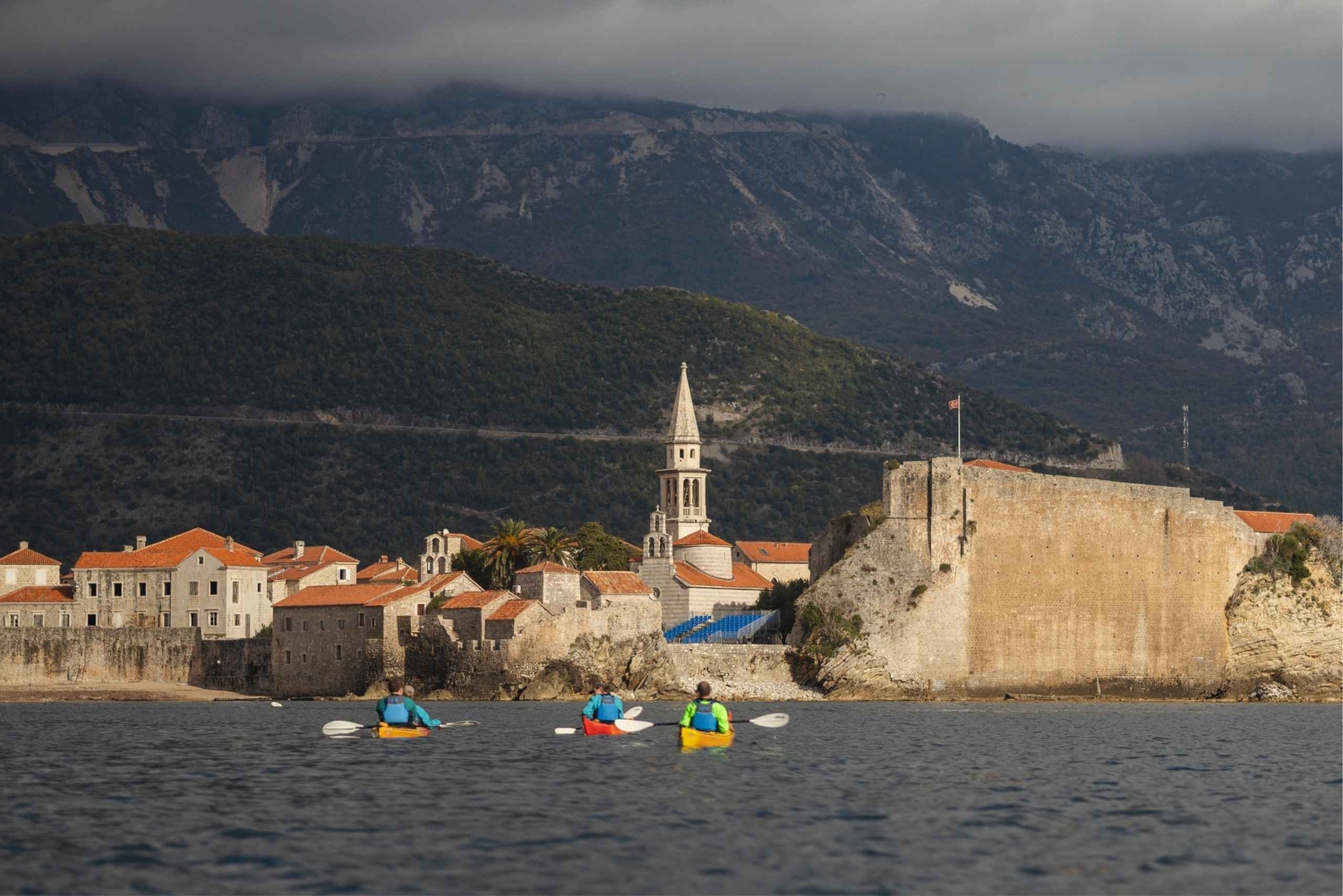 Winterliche Kajaktour von der Altstadt von Budva zu den Küstenhöhlen und der Insel des Hl. Nikolaus. Keine Boote, ruhiges Meer, keine Menschenmassen, kleine Gruppe, warme Trockenanzüge und Spritzschutz.