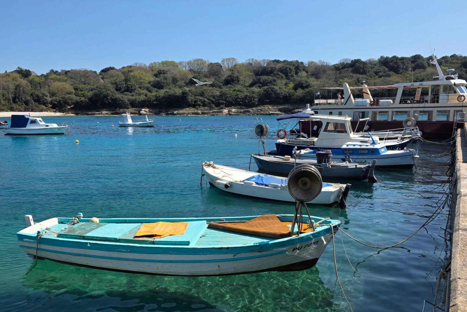 Stich zu einem neuen Ausflug in See. Genieße unbegrenzt Getränke, darunter lokale Weine (Musković), Biere (Darovarsko) und Liköre (Kruškovac). Sieh dir den Naturpark Kamenjak und historische Stätten an, während du kreuzfährst. Halte zum Schwimmen und Schnorcheln in einer Bucht mit vielen Fischen und hohen Klippen an. Diese Tour ist speziell für Paare und Familien konzipiert und verbindet Geschichte mit einem modernen Touch. Wir sorgen dafür, dass du beim Cruisen und Genießen der Umgebung etwas vom lokalen Leben kennenlernst. Die Boote sind schattig und haben eine Küche. So kannst du an Bord bequem eine frisch zubereitete Mahlzeit genießen. Bevor es zurück zum Hafen von Medulin geht, ist ein 2- bis 3-stündiger Halt im Naturpark in der Bucht von Polje geplant. Hier findest du ein altes Fischerdorf, einen nahegelegenen Bauernhof oder einen Spaziergang zu echten Dinosaurierspuren (40 Minuten zu Fuß). Die Tour endet mit einer Panoramafahrt rund um das Medulin-Archipel.Includes