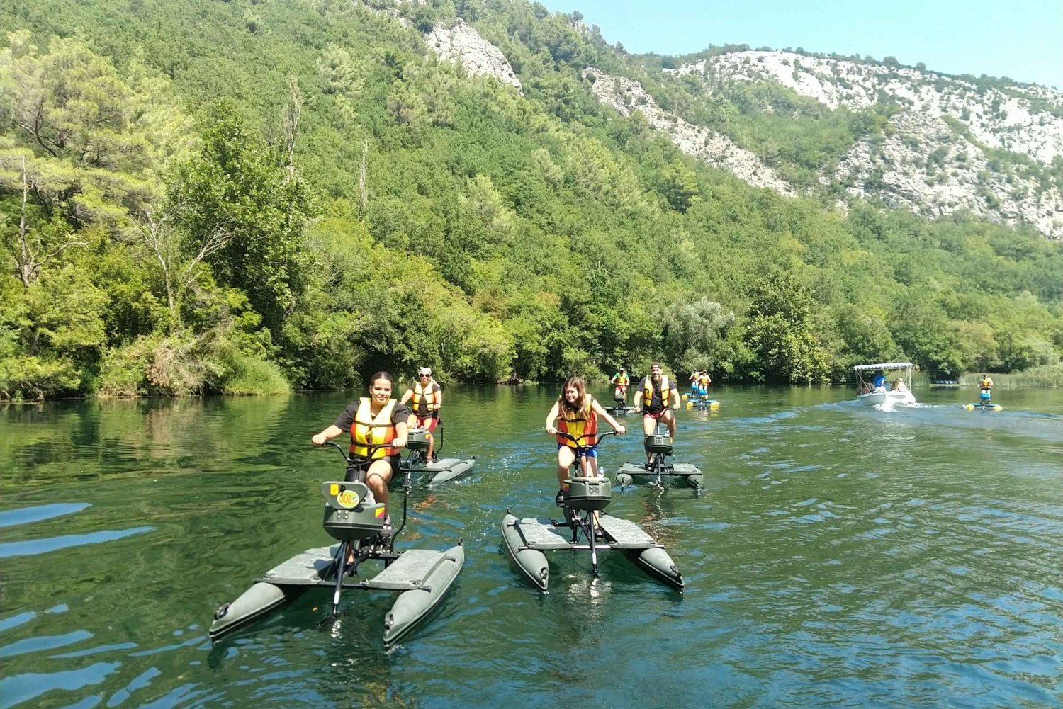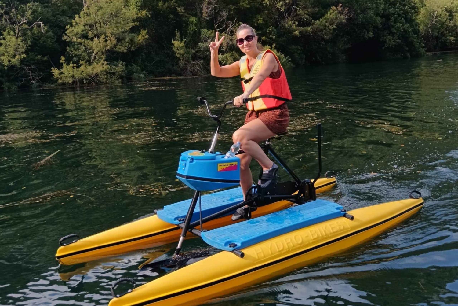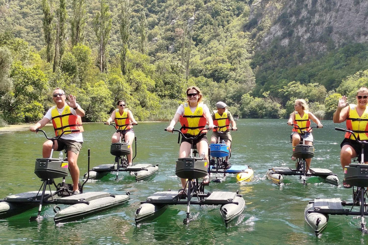 Escapa de lo ordinario y embárcate en una aventura única y emocionante en el hermoso parque del río Cetina, en Omiš. Participa en una forma ecológica de explorar el impresionante paisaje y tomar el sol en el agua. Tu viaje comienza en nuestra propiedad, situada a 5 km de Omiš, y ése es también el punto final. Desde ese punto bajamos 4 km por el río y volvemos, 8 km en total. Relájate con una bicicleta apta para profesionales o principiantes, y perfecta para todas las edades y capacidades. Deslízate en bicicletas especialmente diseñadas para una conducción suave y fácil sobre el agua. Disfruta de la serenidad en tu viaje con bicicletas creadas para ser estables y que puedas centrarte en el paisaje. Pedalea a una velocidad de hasta 12 km/h sintiéndote siempre seguro y protegido. Tus bicicletas acuáticas están equipadas con compartimento portaobjetos, portabebidas, flotador personal y asientos cómodos y ajustables para que puedas relajarte mientras pedaleas por el río.Includes