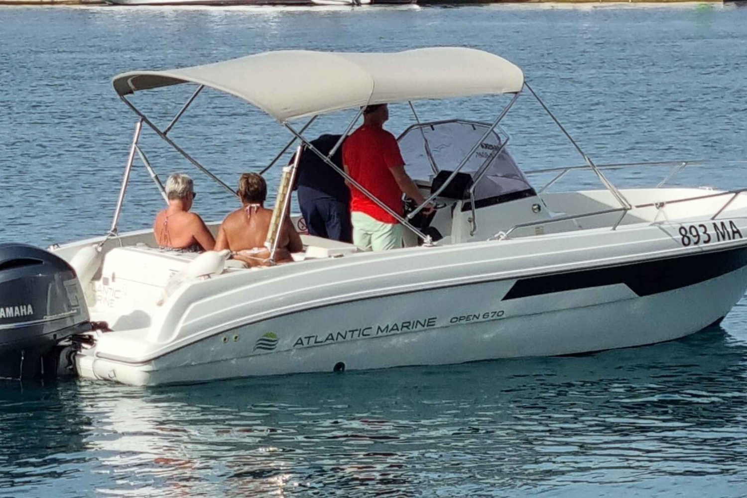 1. We start from Makarska port, Maris Travel sell desk, direction island Hvar to reach little blue cave on island Hvar for a swimm, 2. then we continue to Mala Stiniva cliffs bay. It is a bay surounded by rocky cliffs. Boat is on anchor while guests enjoy swimming, sunbathing, cliff jumping in unique ambience. Snorkling equipment included for guests. 3. Jelsa town we visit to explore stone streets of this island town, nice wine shops, icecream, lavander souvenirs. 4. Our next bay is Zečevo islet Blue lagoon, guests can enjoy swimming, snorkeling or have a drink in a bay cockail bar. 5. We drop you directly on Golden Horn beach (Famous Zlatni Rat beach). 6. On our way back we pass near island Brač where we stop for a short swimm in one of quiet bays with beach swing as a bonus location of our tour. Watch carefully to spot dolphins in their natural habitat.Includes