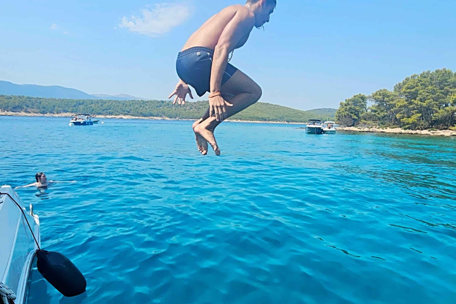 Enjoy a captivating 5-hour speedboat tour from Makarska, starting in the morning at 8am and afternoon at 1:30pm, to islands of Hvar, Brač, and Zečevo. After an approx. 40-minute cruise, relax in a 25-minute stay at the hidden gem on island Hvar called Pokrivenik, followed by a 20-minute exploration of the mesmerizing Little Blue Cave just 5 minutes away from Pokrivenik. The next stop is the most famous town on northern side of Hvar island, Jelsa town, where we’ll about to stay for 60 minutes. After the walk and coffee break in town Jelsa we’ll head towards the second island, island Zečevo with the stunning Blue Lagoon where you can swim and enjoy at the Bungalow Bar for approx. 40 minutes. Conclude your adventure with a refreshing 30-minute swim at the hidden bay of island Brač, ensuring a perfect blend of exploration and leisure on this unforgettable journey.Includes