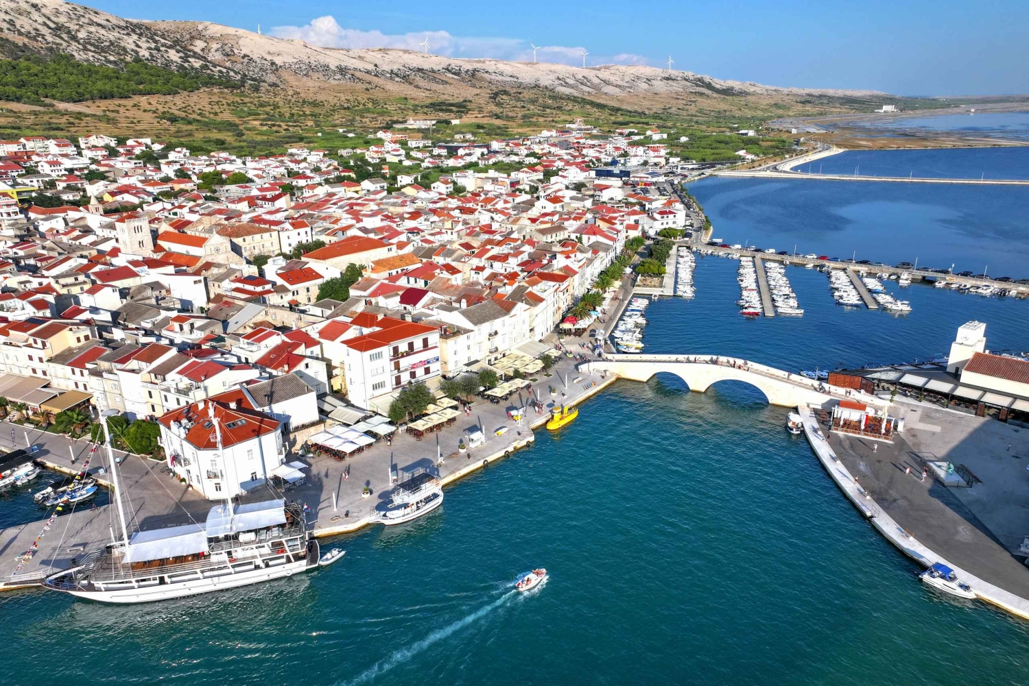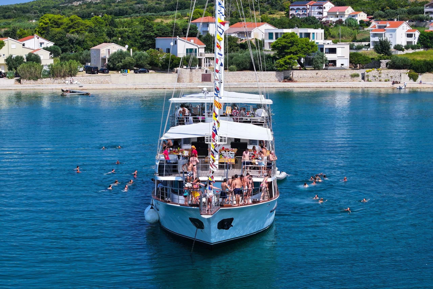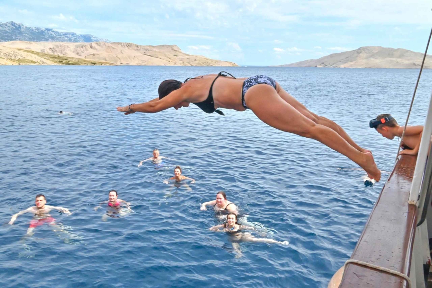 The tour departs from the main city waterfront in Pag town. After enjoying a welcome drink, you will begin to sail along the coast towards the popular strait of Pag while admiring the view of the unique karstic landscape. The first swimming break is planned in Zaton bay. You can swim, jump off the boat and visit the beach. The sailing continues towards a cave, where the boat stops and the guests can pass through 30m of the cave with a guide: the first part is meant for walking and then gradually you descend into the sea and continue swimming inside the cave. Those who do not want to go into the cave can stay on the boat, swim, and enjoy the view. Afterwards, you continue sailing towards Slana bay where a break for rest and swimming is planned. Adrenaline lovers can try out a climbing polygon. The route continues towards Beriknica, one of the most breathtaking beaches of Pag Bay, where another swimming break is planned. The tour continues towards Rozin Bok, a sandy beach surrounded by impressive rocks, above which rises an impressive hill. After the final swimming break, the tour ends with the return to Pag town.Includes