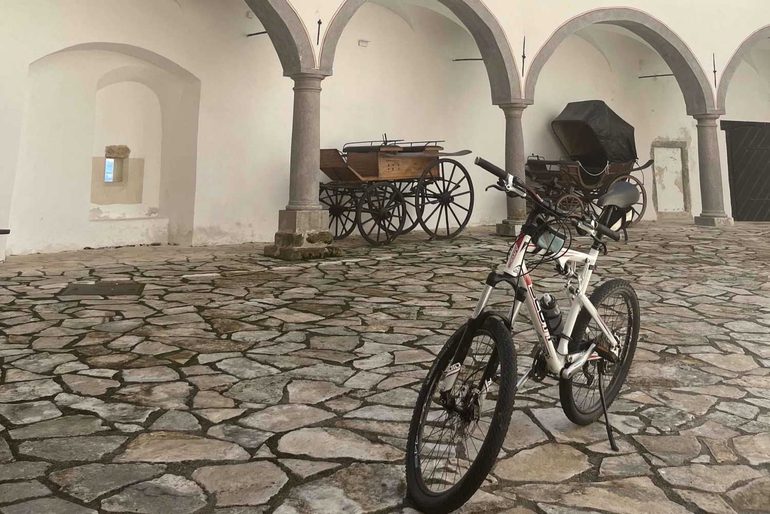 Cycling guidance by a licensed MTB guide and interpreter of cultural and historical heritage, use of an e-bike, helmet and backpack with a bottle of water and energy bar with wine tasting