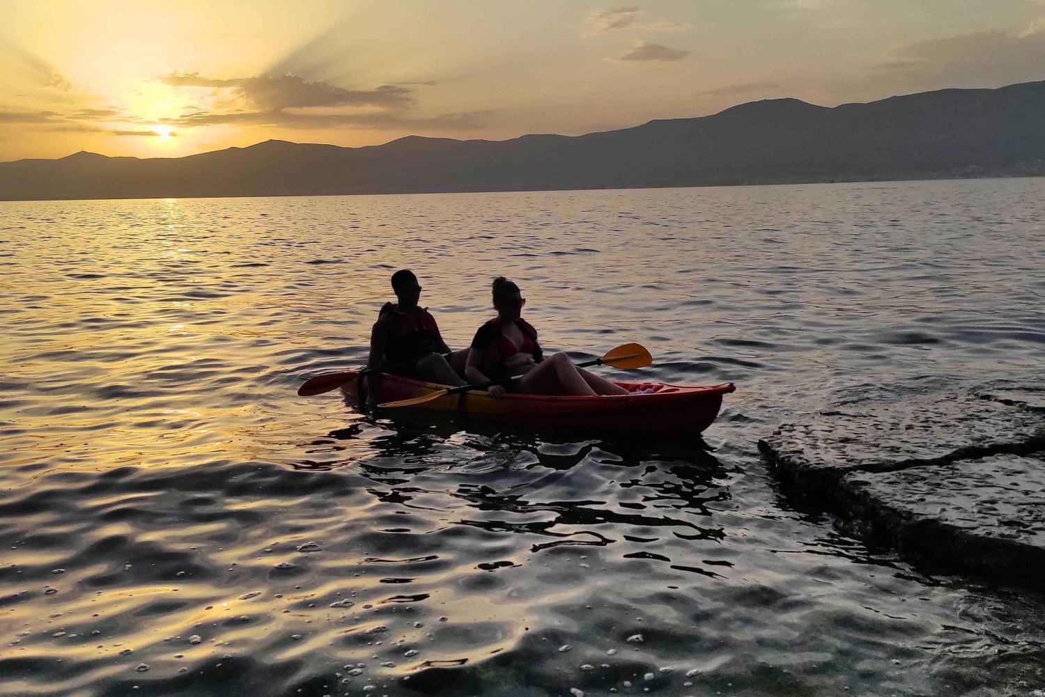 Commencez l'aventure estivale ultime à Split avec un bref exposé sur la sécurité et des instructions de pagayage adaptées aux débutants, vous préparant à un voyage inoubliable dans la mer Adriatique. Embarquez pour une exploration en kayak autour de la péninsule époustouflante du parc Marjan, en vous régalant du panorama époustouflant de la baie de Kaštela et des montagnes majestueuses. Profitez des anecdotes locales captivantes sur Split et la Dalmatie pendant que vous pagayez vers un endroit idyllique propice au saut de falaise et à la plongée avec tuba dans la mer Adriatique ! Alors que votre voyage se termine, pagayez en arrière avec une bande sonore jusqu'au point de départ sous la toile magique d'un soleil couchant sur les montagnes. Avec des vues à couper le souffle et une expérience qui laisse une marque indélébile dans votre mémoire, vous emporterez un morceau de cette aventure avec vous pour toujours ! Terminez la journée de la meilleure façon possible et faites du kayak au large de Split au coucher du soleil. Nagez et faites de la plongée avec tuba autour de la péninsule du parc Marjan et profitez d'une vue imprenable sur le coucher de soleil derrière la montagne.Includes