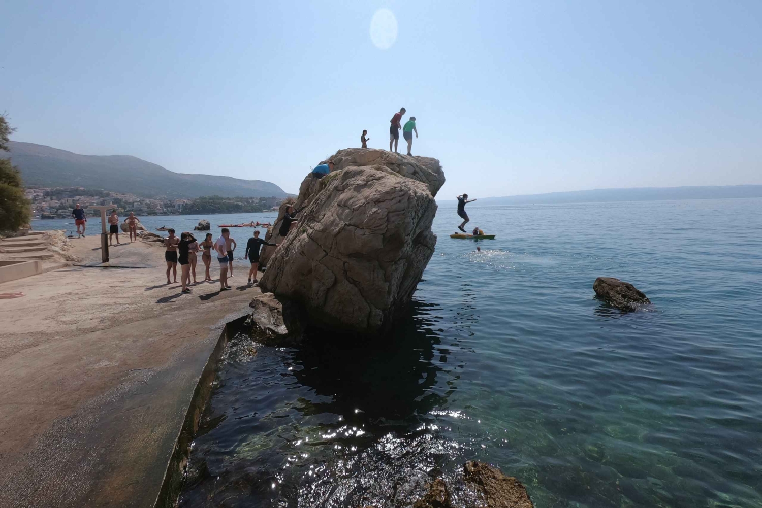ツアーは、キャンプ場のビーチにあるスプリットの最も古い郊外都市、ストブレッチから始まります。 カヤックの簡単な紹介の後、海に出て、美しく静かなズルノヴニツァ川の河口に向かいます。 すぐに、偉大なモソール山の尾根と、ズルノヴニツァ川にそびえ立つ美しい緑の野原が見えます。 川を漕いでいると、雰囲気は完全に落ち着いています。木々が日陰を作り、澄んだ空気とズルノヴニツァの冷たい水を感じることができます。 川は、暑い夏の日にリフレッシュと逃避を提供する完璧なオアシスです。 ズルノヴニツァ川を少し進むと、アドリア海に戻ります。 遠くに島々が見える青い海を滑空すると、景色が変わります。すぐに、原住民が家を建てたストブレッチの白い崖が見えてきます。 ここでは、エキサイティングなクリフ ジャンプやシュノーケリングを行って、アドリア海の海底を探索できます。Includes