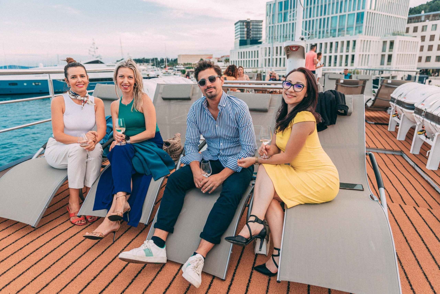 Ontdek de parels van Split en de omliggende eilanden aan boord van een motorjacht Tamaris. Vaar naar Borkko Beach op het eiland Čiovo, Maslinica op het eiland Šolta en de Blue Lagoon op het eiland Drvenik Veliki. Geniet van een gratis kopje koffie en croissant bij vertrek en geniet van een mediterrane lunch in de Blauwe Lagune. Stap aan boord van de Tamaris, een 27-meter lange dagcruiser met 3 deks: 2 salons met airconditioning, een ruim open dek met een volledig uitgeruste bar en een zonneterras. Ontspan met alle comfort aan boord van de boot, uitgerust met 4 toiletten, douches, een ruim zwemplatform en professioneel wifi. Begin je dag met een kopje koffie en een croissant terwijl je langs de zuidkant van het eiland Čiovo vaart naar de strandbar Borkko om te ontspannen of te zwemmen vanaf het strand. Pak de snorkeluitrusting en verken het onderwaterleven. Na Borkko varen we naar de Blauwe Lagune, het hoogtepunt van de dag, een turquoise baai met kristalheldere zee. Geniet van een traditionele mediterrane lunch, gevolgd door vrije tijd om de schoonheid van de Blue Lagoon te verkennen. Geniet van de gratis drankjes terwijl je van de zon geniet, pak de gratis snorkeluitrusting en spring in de kristalheldere zee of ontspan gewoon op ons ruime zonnedek. Geniet van een korte cruise naar onze laatste halte van de dag, Maslinica op het eiland Šolta, een klein vissersdorpje waar je de relaxte levensstijl van het eiland kunt ontdekken, vers gezette koffie kunt drinken in een van de lokale cafetaria's en het Marchi-kasteel met zijn prachtige park kunt bezoeken. Ga lekker zwemmen op het strand of ontspan in de strandbar Punta. Geniet tijdens je cruise terug naar Split van verse gekoelde watermeloen, geserveerd door onze bemanning, en geniet van een prachtig uitzicht op de omliggende eilanden.Includes