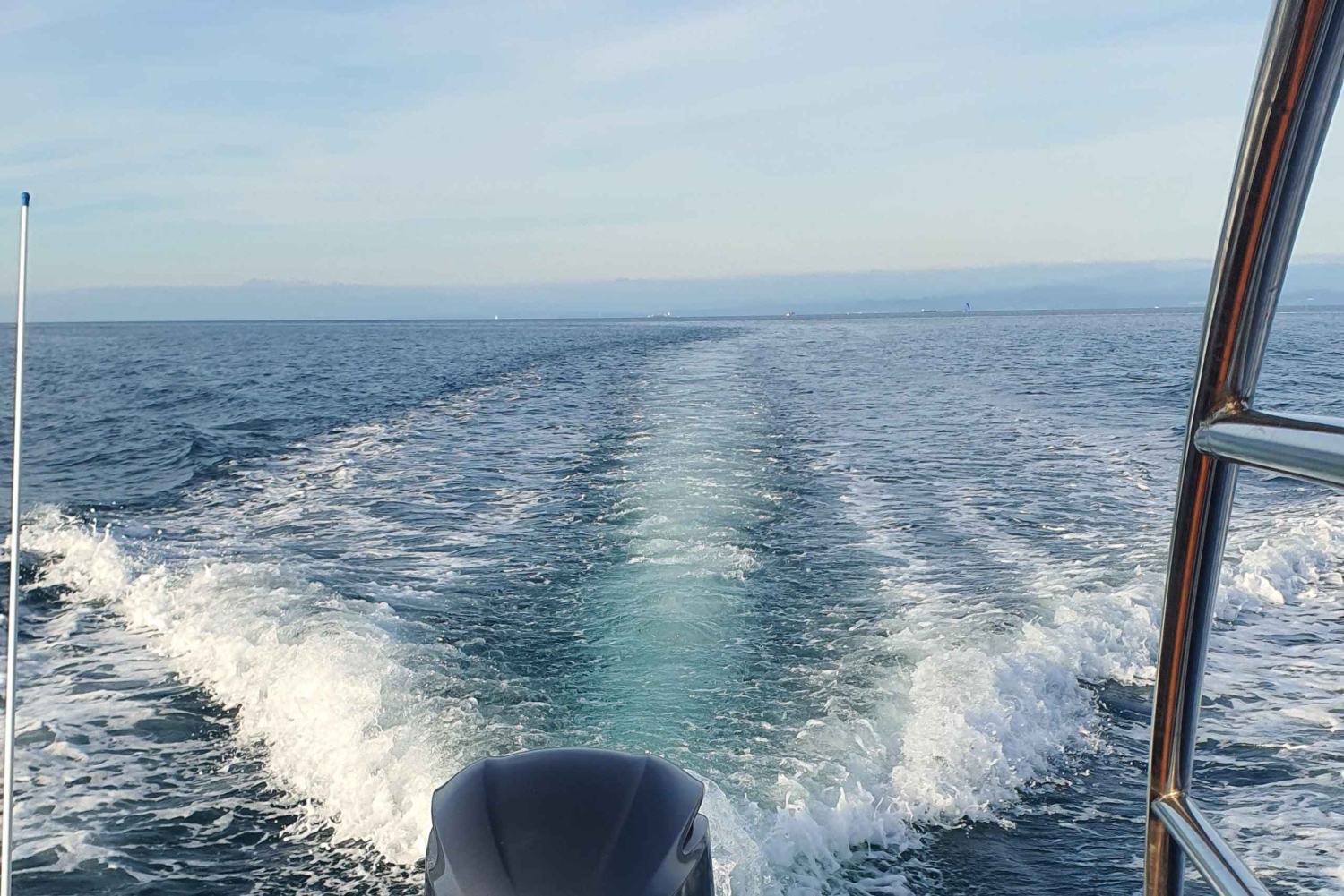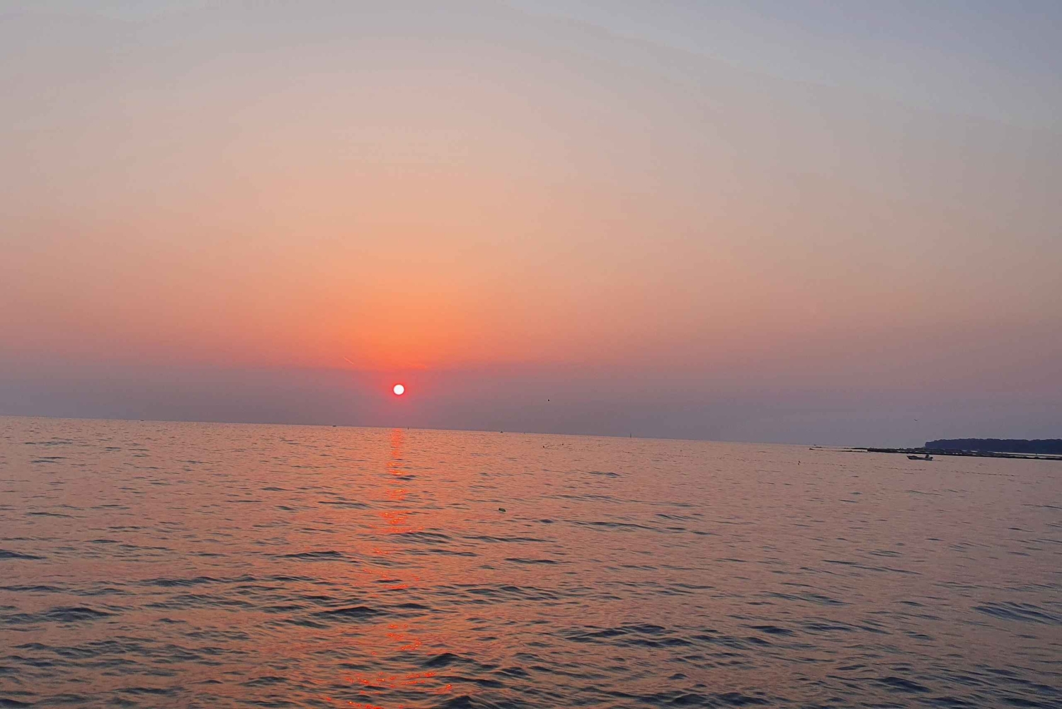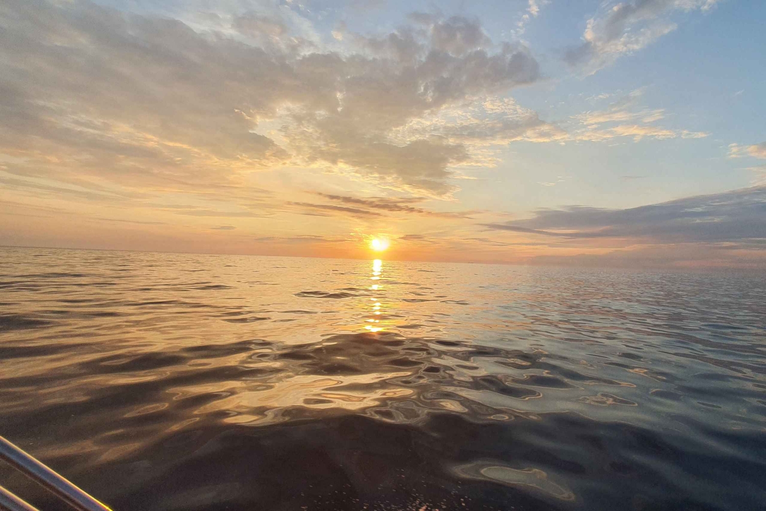 Delfinsafari er hver kveld fra kl. 17.30 til kl. 19.00. Eller 19.15 til 20.45 4 personer er minimum, 20 maksimum. Å se delfiner ved solnedgang er definitivt et høydepunkt på ferien. Med respektabel tilnærming kan delfinene komme ganske nær båten vår. Båten er 9 m lang og 3 m bred, og gir nok plass, komfort og sikkerhet for hver passasjer, selv om sjøen er litt bølgete. Motoren drives av Yamaha 300 hk. Den har et lydsystem med fire høyttalere, kjøleskap og redningsvester hvis du føler deg tryggere med det. Sjansen for å se delfiner er 95 %.Includes