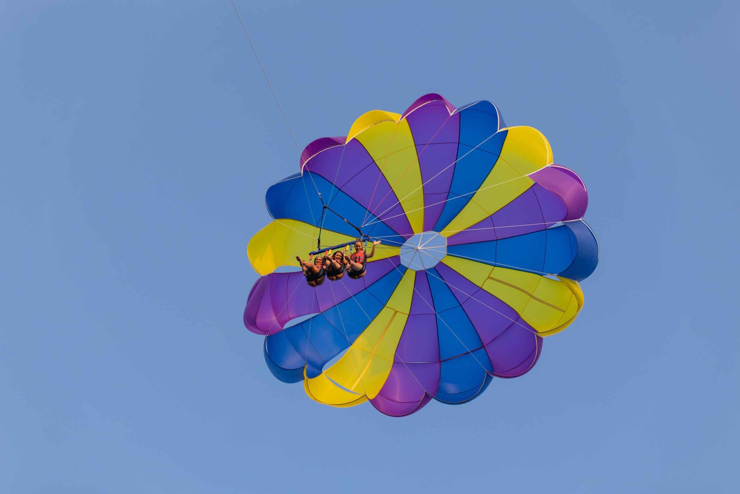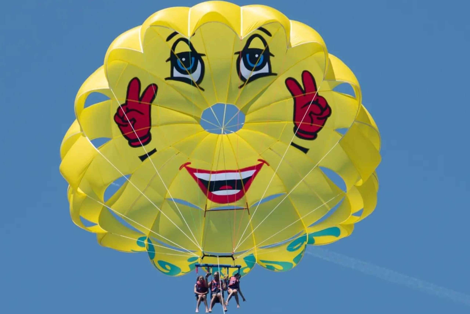 Parasailing jest jedną z najbardziej pożądanych i atrakcyjnych aktywności tutaj. Doświadczysz bardzo bezpiecznego i łatwego lotu na pokładzie dobrze utrzymanej łodzi z bardzo doświadczoną załogą. Widoki zapierają dech w piersiach, a zabawa jest gwarantowana. Przed każdym lotem załoga wyjaśni Ci wszystko, co musisz zrobić podczas krótkiej odprawy. Najważniejszą rzeczą, którą musisz zrobić, to uśmiechnąć się do aparatu, aby zrobić ładne zdjęcia. Bezpieczeństwo jest zawsze na pierwszym miejscu; Twój uśmiech po podróży jest naszym celem! Nie ma ograniczeń wiekowych, a ta aktywność jest dla każdego.Includes