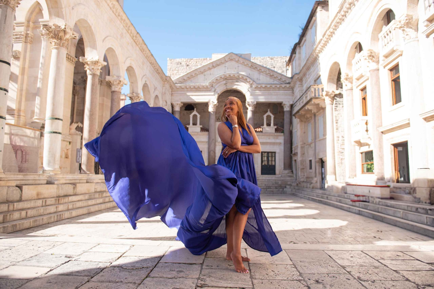 1 valfri färg på flygande klänning (gul (2,5 m lång svans) - blå/lila (2,5 m lång svans) - röd/rosa (2 m lång svans) - svart/mörkblå (1 m lång svans) En assistent till en flygande klänning för att få den att flyga 15 utvalda redigerade professionella foton De bästa platserna i Split Hjälp med poseringEasy cancellation