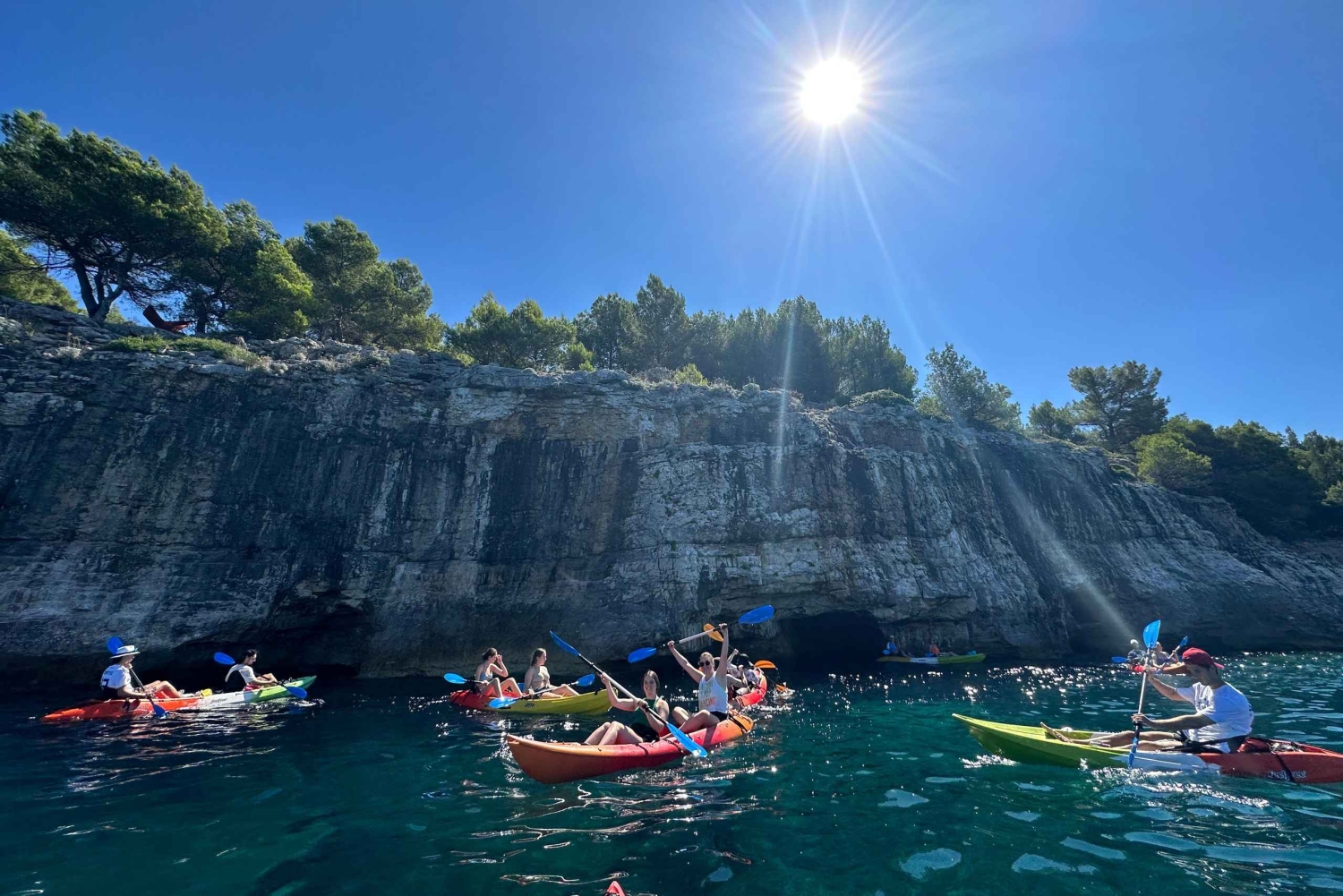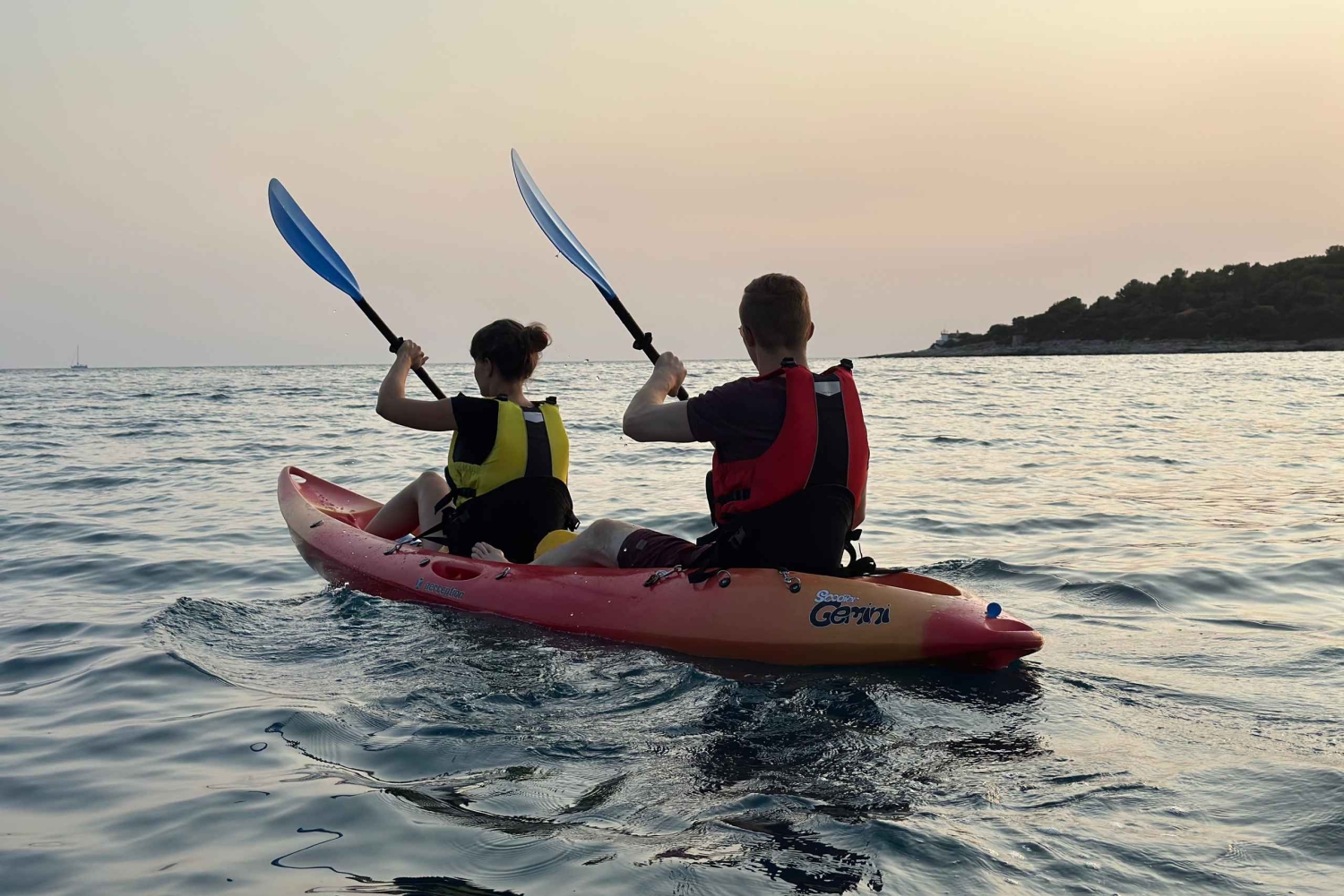 Anländ till din destination och få ett varmt välkomnande av din vänliga guide som ger dig en kort genomgång av turen, säkerhetsinformation och en översikt över höjdpunkterna. När genomgången är klar är det dags att ge sig ut på ett oförglömligt äventyr. Ge dig iväg i kajaken och glid fram i 20 minuter mot dagens första stopp – den lilla, fascinerande grottan Grotta di quarzo. Därefter fortsätter vi resan mot Verudela Canyon, ett naturligt underverk som väntar på er ankomst. Det tar cirka 20 minuter att nå kanjonen, där ni möts av imponerande klippor, smaragdgrönt vatten och en känsla av lugn. Paddla längs kanjonväggarna och njut av den omgivande naturen. Fördjupa dig i lugnet i detta naturunderverk medan du paddlar genom den smala passagen och tittar på de imponerande klippformationerna som formats av århundraden av naturkrafter. Efter Verudela Canyon sätter du sikte på den pittoreska ön Fratarski. Ön är en dold pärla med en lugn atmosfär och vacker natur. Strax bakom Fratarski, på ön Fraškerić, tar du en 20 minuters paus. Ta en lugn promenad längs stranden, sola eller bara koppla av och njut av den fridfulla omgivningen. Det kristallklara vattnet lockar till ett uppfriskande dopp, och snorklingsentusiaster kommer att glädjas åt möjligheten att upptäcka den livliga undervattensvärlden som sjuder av färgglatt marint liv. Om förhållandena är bra kan frivilliga följa med guiden för att besöka en gömd grotta på ön. Återvänd till Vinkuran hamn, där din kajaktur avslutas. Reflektera över dagens otroliga upplevelser, den fantastiska kanjonen, den fascinerande grottan och de fridfulla öarna Fratarski och Fraškerić. Minnena du har skapat och de naturliga underverk du har upplevt kommer att stanna kvar länge efter att resan är slut och påminna dig om skönheten och magin i detta oförglömliga kajakäventyr. OBS: Vi insisterar på att deltagarna inte hoppar från höga platser på grund av risken för skador! Turen kräver måttlig fysisk aktivitet och deltagarna måste kunna paddla själva. Turen är inte för icke-simmare. Genom att boka denna tur bekräftar och accepterar gästerna att deltagandet sker på egen risk. Arrangören tar inget ansvar för eventuella skador, förluster eller skador som kan uppstå under aktiviteten. Deltagarna måste vara i god fysisk kondition och följa alla säkerhetsinstruktioner som ges av guiden.Includes
