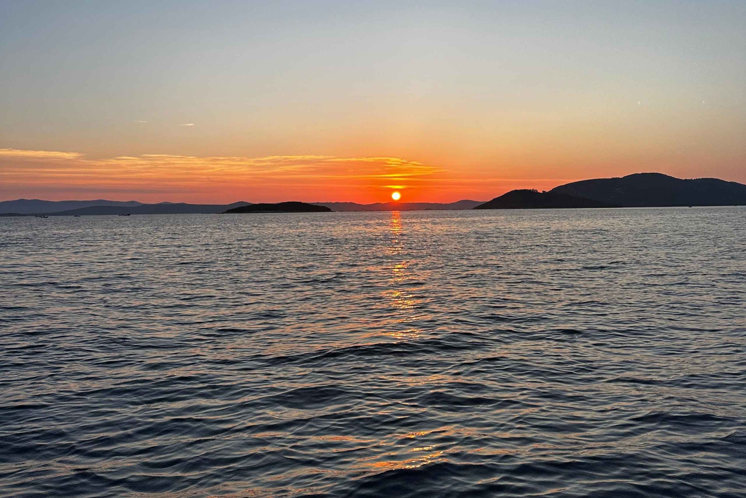 Börja din upplevelse i Zadar, vid Knez Branimir-kusten. Kryssa långsamt längs stadens kustlinje, passera Havsorgeln och njut av utsikten över Gamla stan från havet. Segla genom Zadars skärgård och njut av den fantastiska naturen. Med en liten grupp och en skeppare får du en unik upplevelse av denna aktivitet. Följ med på en avkopplande och naturskön båtresa i solnedgången från den berömda Havsorgeln i Zadar till den charmiga hamnen Foša. Denna korta men oförglömliga tur är ett av de bästa sätten att uppleva skönheten i Zadars kust och historiska gamla stad under den gyllene timmen. När du kryssar längs kusten kan du njuta av panoramautsikten över gamla stadsmurar, stenbyggnader och det lugna Adriatiska havet som glittrar i solnedgångens färger. Atmosfären är fridfull och romantisk, perfekt för par, vänner eller alla som vill koppla av och njuta av stunden. Ta med din kamera – denna tur erbjuder fantastiska fotomotiv. En gratis drink ingår.Includes